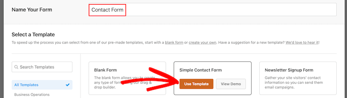 This will open the WPForms drag and drop form builder template library. Start by giving your contact form a name and then select your contact form template.