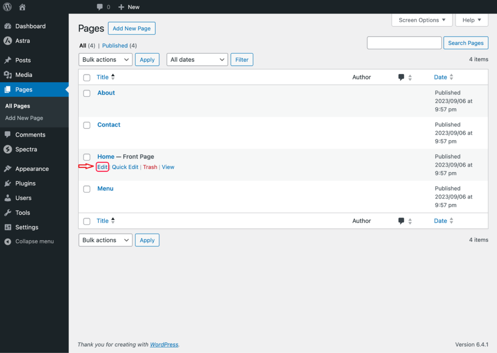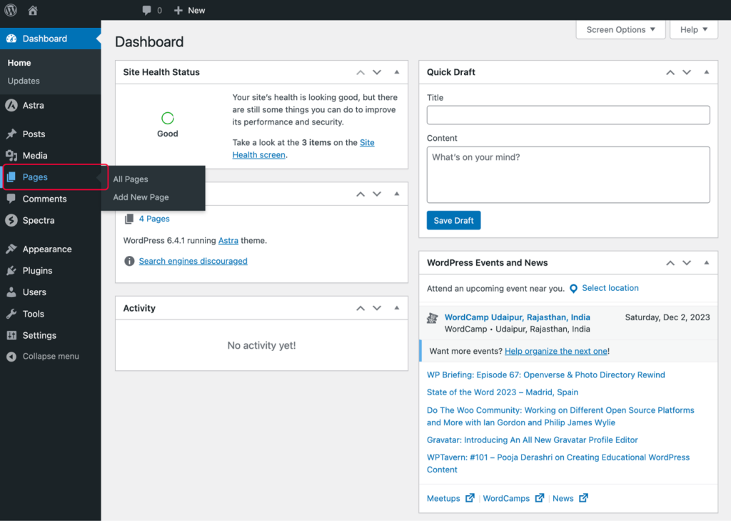 Go to your WordPress admin area and click on Pages.