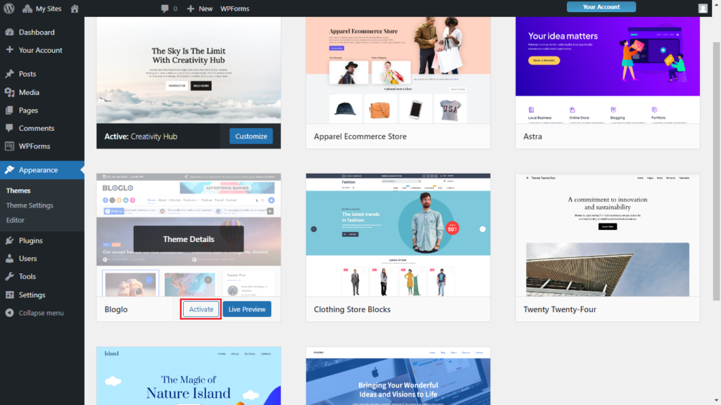 • Hover over the other themes to view the Theme Details. Live Preview one of them, or Activate a different one.